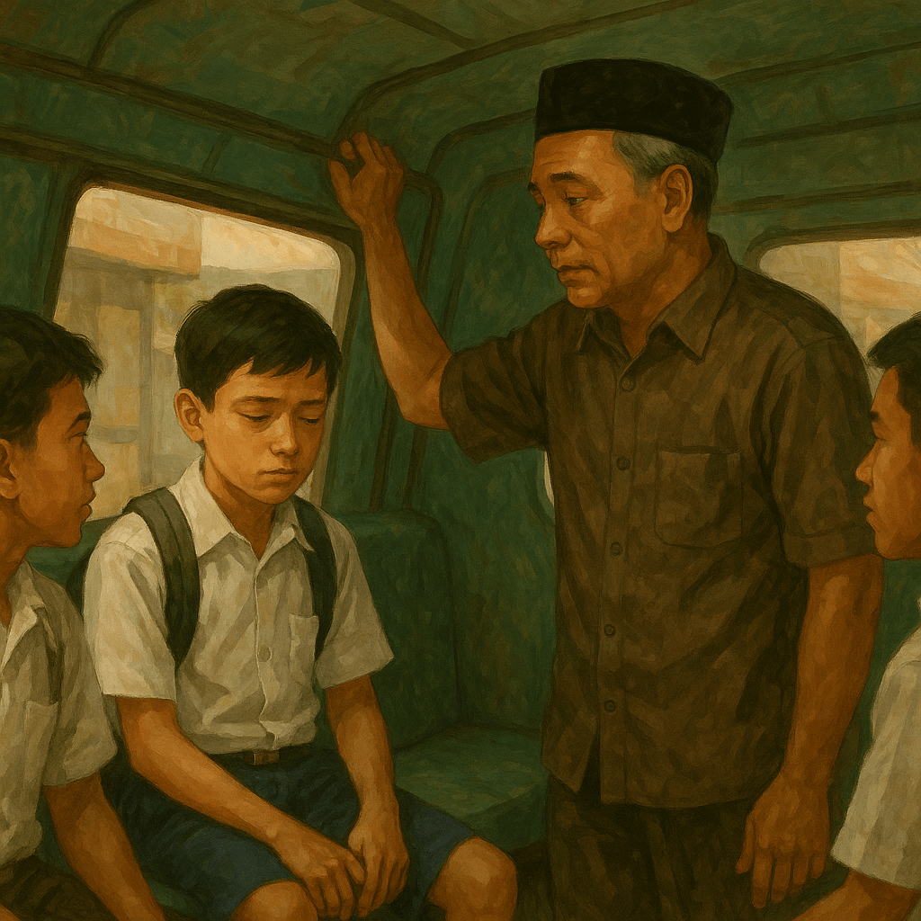 Di tengah perjalanan, angkot berhenti. Seorang bapak-bapak naik. Deg. Jantungku berdegup kencang. Aku mengenali wajah itu—Pak Kamiyun, guru matematika di SD-ku. Ingatan segera menyeretku kembali ke kelas empat SD, papan tulis hijau tua, derit kapur, dan diriku yang berdiri di depan kelas, tak mampu mengerjakan soal matematika yang diberikan Pak Kamiyun. Saat itu aku menangis, dimarahai beliua yang tidak bisa mengerjakan soal dan juga malu di hadapan teman-teman.